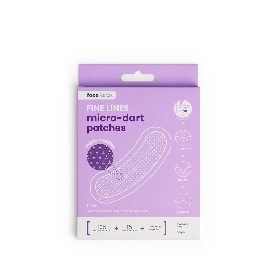 Target fine lines with our Fine Lines Micro-Dart Patches. Infused with a powerhouse of eye-smoothing actives; 10% hyaluronic acid, 1% niacinamide, vegan collagen, and peptides, they work to rehydrate the under-eye area, effectively relieving dryness and boosting skin elasticity, providing a more rejuvenated complexion.