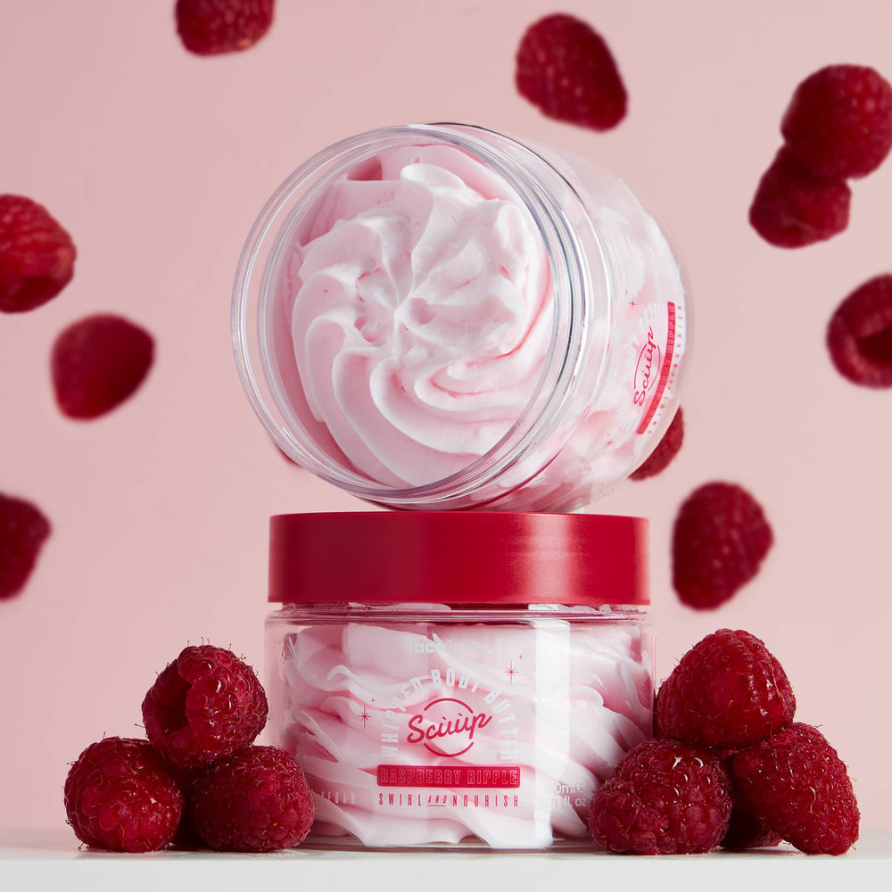 Achieve soft-serve, silky skin with our Raspberry Ripple Whipped Body Butter. Infused with nourishing shea and cocoa butter with antioxidant-rich raspberry extract, it acts as an indulgent moisturising treat to lock in luminosity and long-lasting hydration.  Its creamy yet airy texture melts effortlessly into the skin, leaving you with supple, smooth, and sweet-smelling results.