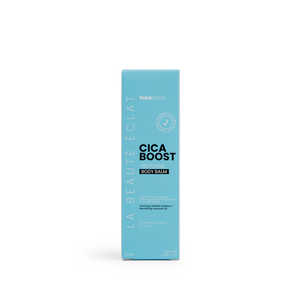 Deeply moisturise dehydrated skin with our Cicaboost Restoring Body Balm. Infused with calming centella extract, moisture-locking hyaluronic acid, and nourishing avocado oil, it delivers essential moisture and nourishment while helping support skin barrier restoration. Use as an intensely hydrating treatment to leave dry, troubled areas feeling extra soft, restored, and revitalised with a light aloe vera aroma. Dermatologically tested and vegan friendly.