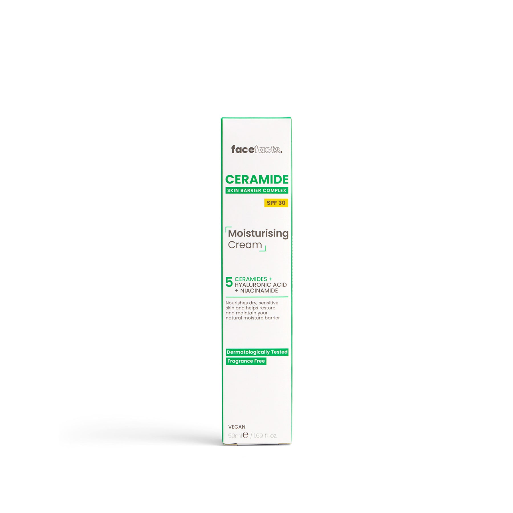 Hydrate and protect your skin with our Ceramide Moisturising Cream with SPF 30. Our lightweight cream hydrates even the most dry and sensitive skin. Infused with our skin barrier complex of 5 ceramides, moisture-locking hyaluronic acid, glycerin and niacinamide, our moisturiser is dermatologically tested and helps soothe and strengthen the skin barrier to prevent moisture loss whilst providing SPF 30 protection. Give your skin the extra care it deserves!